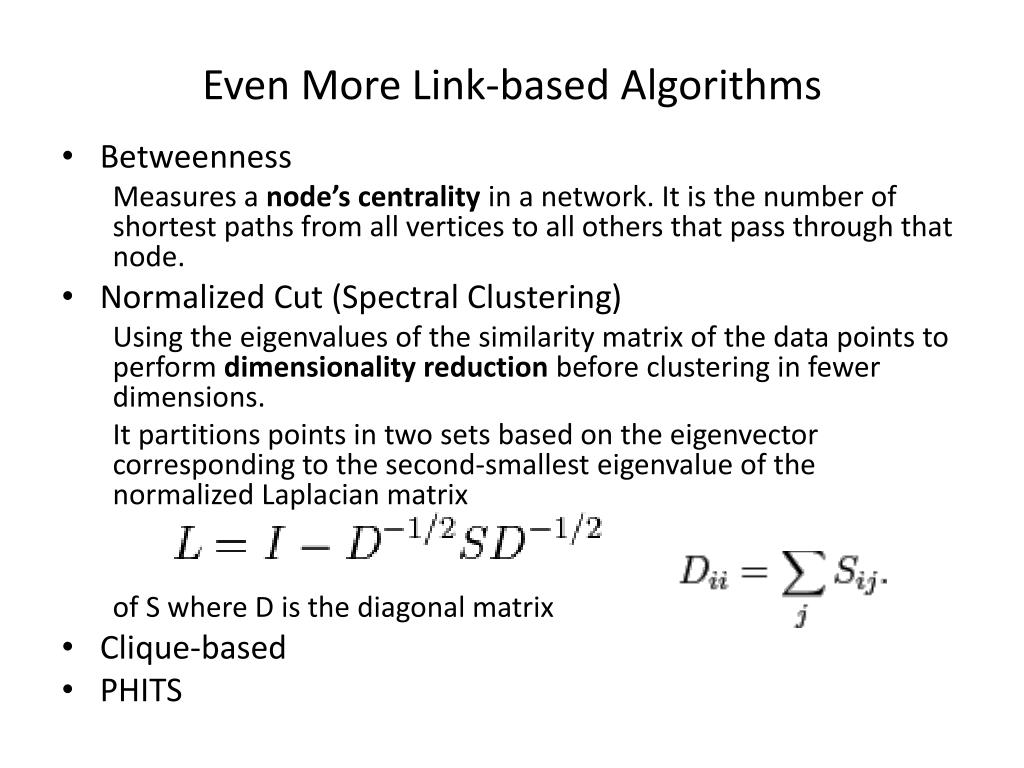 Even More Link-based Algorithms • Betweenness Measures a node’s centrality in a network. It is the number of shortest paths from all vertices to all others that pass through that node. • Normalized Cut (Spectral Clustering) Using the eigenvalues of the similarity matrix of the data points to perform dimensionality reduction before clustering in fewer dimensions. It partitions points in two sets based on the eigenvector corresponding to the second-smallest eigenvalue of the normalized Laplacianmatrix of S where D is the diagonal matrix • Clique-based • PHITS