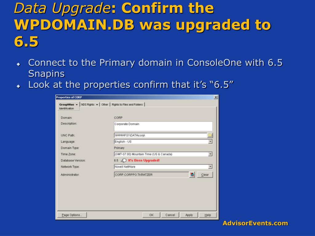 Data Upgrade: Confirm the WPDOMAIN.DB was upgraded to 6.5 • Connect to the Primary domain in ConsoleOne with 6.5 Snapins • Look at the properties confirm that it’s “6.5”