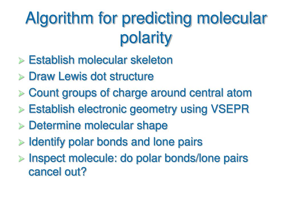 Algorithm for predicting molecular polarity • Establish molecular skeleton • Draw Lewis dot structure • Count groups of charge around central atom • Establish electronic geometry using VSEPR • Determine molecular shape • Identify polar bonds and lone pairs • Inspect molecule: do polar bonds/lone pairs cancel out?