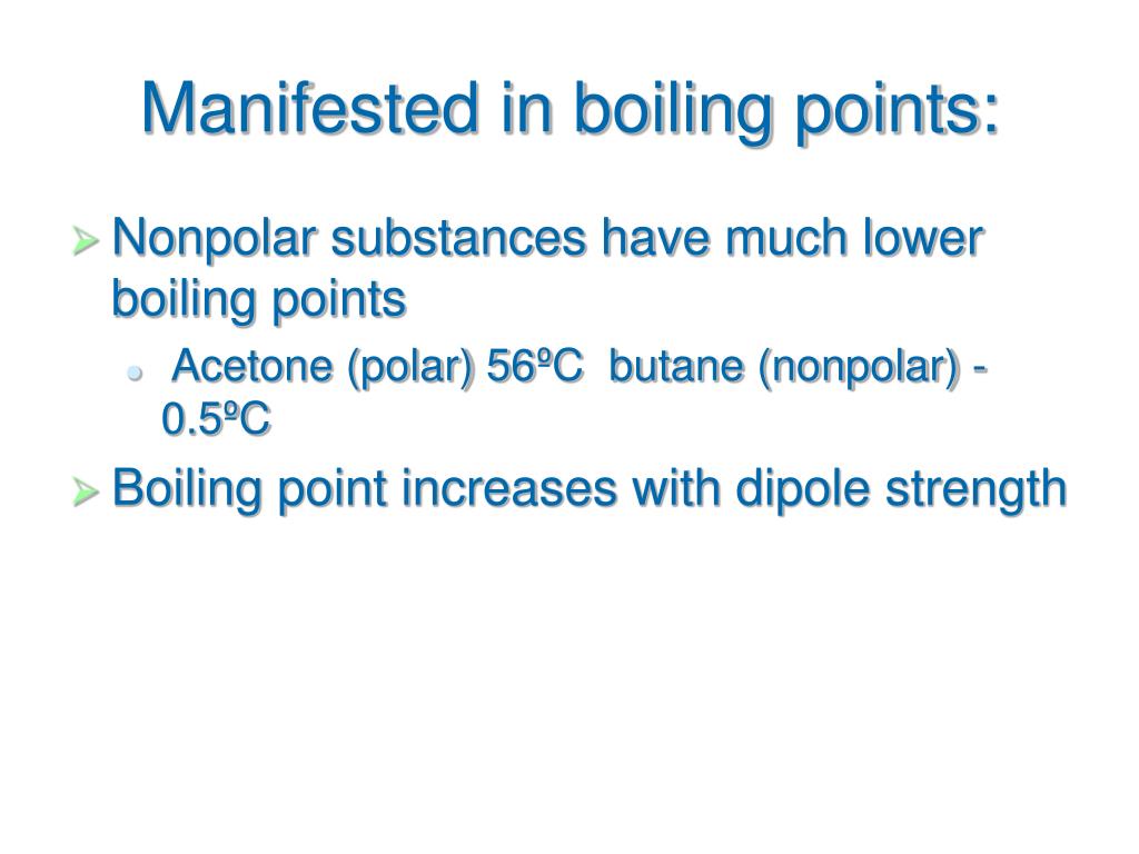 Manifested in boiling points: • Nonpolar substances have much lower boiling points • Acetone (polar) 56ºC butane (nonpolar) -0.5ºC • Boiling point increases with dipole strength