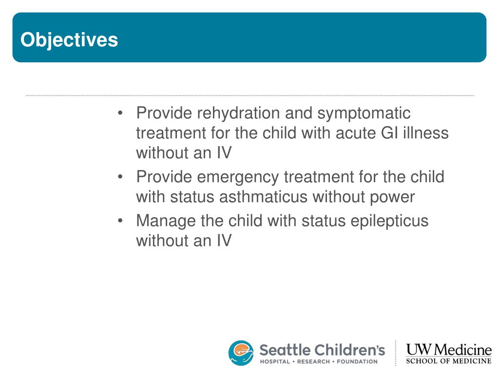 Objectives Provide rehydration and symptomatic treatment for the child with acute GI illness without an IV Provide emergency treatment for the child with status asthmaticus without power Manage the child with status epilepticus without an IV