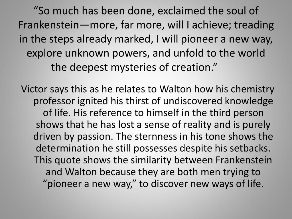 “So much has been done, exclaimed the soul of Frankenstein—more, far more, will I achieve; treading in the steps already marked, I will pioneer a new way, explore unknown powers, and unfold to the world the deepest mysteries of creation.” Victor says this as he relates to Walton how his chemistry professor ignited his thirst of undiscovered knowledge of life. His reference to himself in the third person shows that he has lost a sense of reality and is purely driven by passion. The sternness in his tone shows the determination he still possesses despite his setbacks. This quote shows the similarity between Frankenstein and Walton because they are both men trying to “pioneer a new way,” to discover new ways of life.