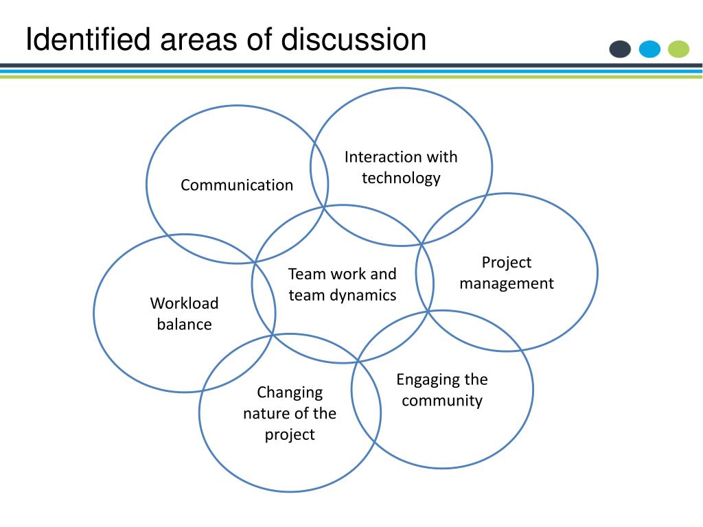 Identified areas of discussion Interaction with technology Communication Project management Team work and team dynamics Workload balance Engaging the community Changing nature of the project
