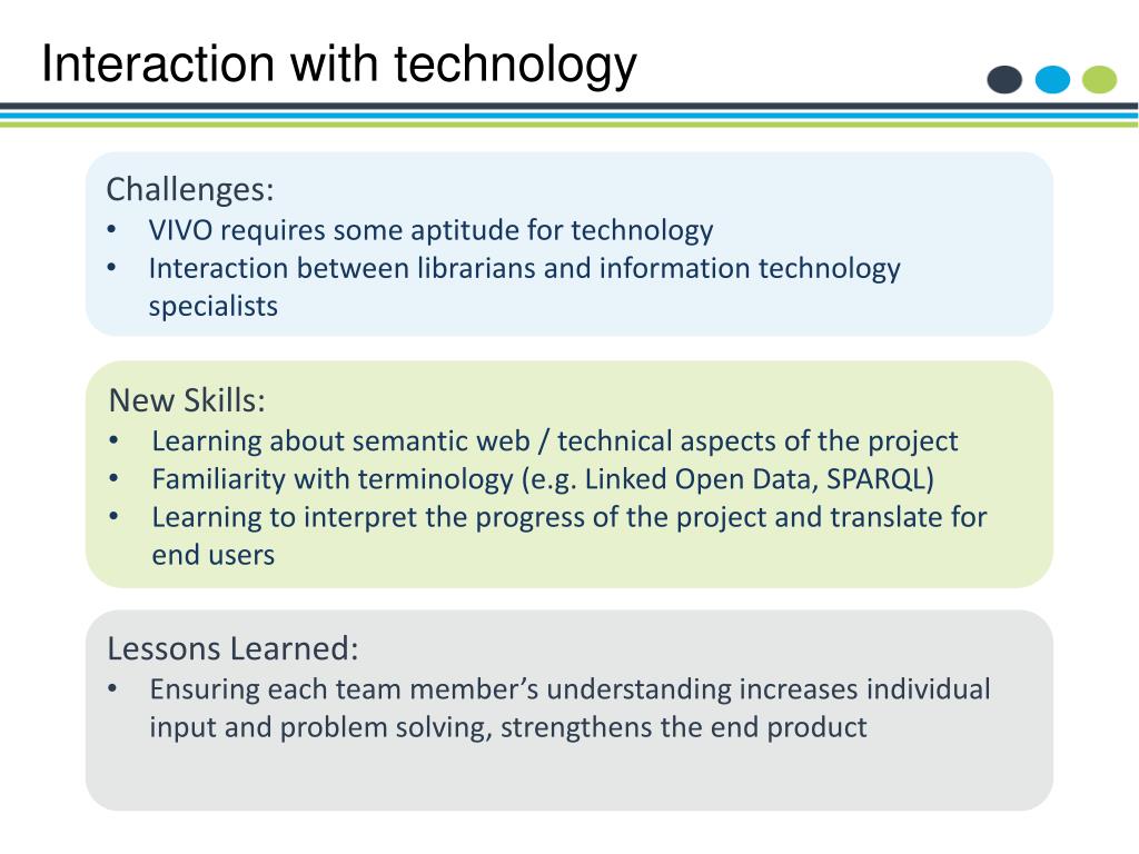 Interaction with technology • Challenges: • VIVO requires some aptitude for technology • Interaction between librarians and information technology specialists • New Skills: • Learning about semantic web / technical aspects of the project • Familiarity with terminology (e.g. Linked Open Data, SPARQL) • Learning to interpret the progress of the project and translate for end users • Lessons Learned: • Ensuring each team member’s understanding increases individual input and problem solving, strengthens the end product