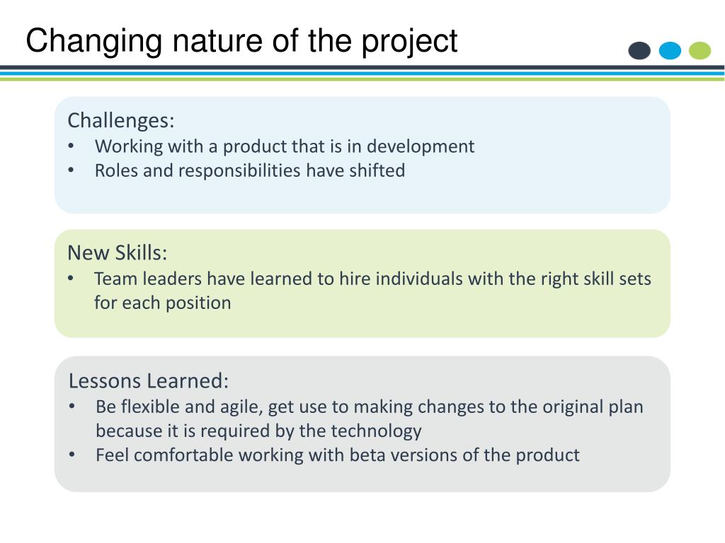 Changing nature of the project • Challenges: • Working with a product that is in development • Roles and responsibilities have shifted • New Skills: • Team leaders have learned to hire individuals with the right skill sets for each position • Lessons Learned: • Be flexible and agile, get use to making changes to the original plan because it is required by the technology • Feel comfortable working with beta versions of the product