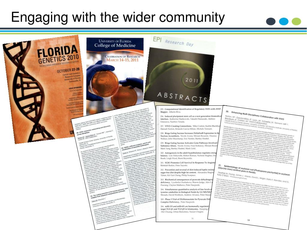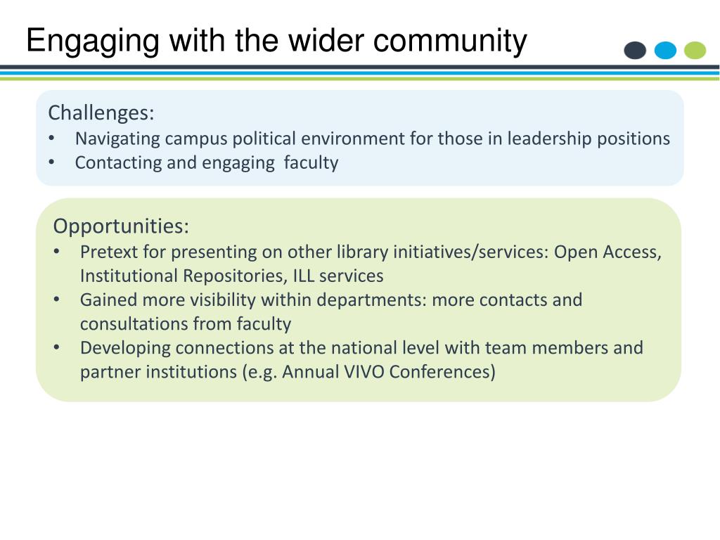 Engaging with the wider community • Challenges: • Navigating campus political environment for those in leadership positions • Contacting and engaging faculty • Opportunities: • Pretext for presenting on other library initiatives/services: Open Access, Institutional Repositories, ILL services • Gained more visibility within departments: more contacts and consultations from faculty • Developing connections at the national level with team members and partner institutions (e.g. Annual VIVO Conferences)