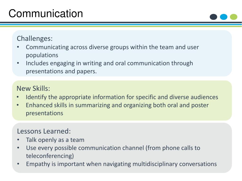 Communication • Challenges: • Communicating across diverse groups within the team and user populations • Includes engaging in writing and oral communication through presentations and papers. • New Skills: • Identify the appropriate information for specific and diverse audiences • Enhanced skills in summarizing and organizing both oral and poster presentations • Lessons Learned: • Talk openly as a team • Use every possible communication channel (from phone calls to teleconferencing) • Empathy is important when navigating multidisciplinary conversations
