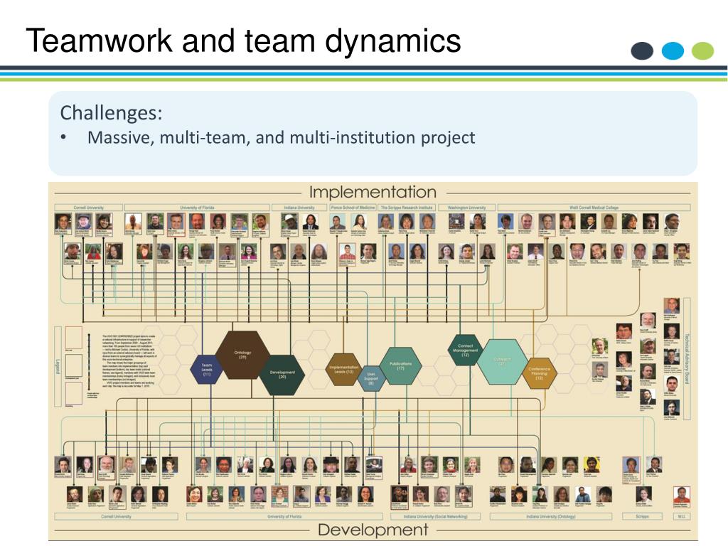 Teamwork and team dynamics • Challenges: • Massive, multi-team, and multi-institution project