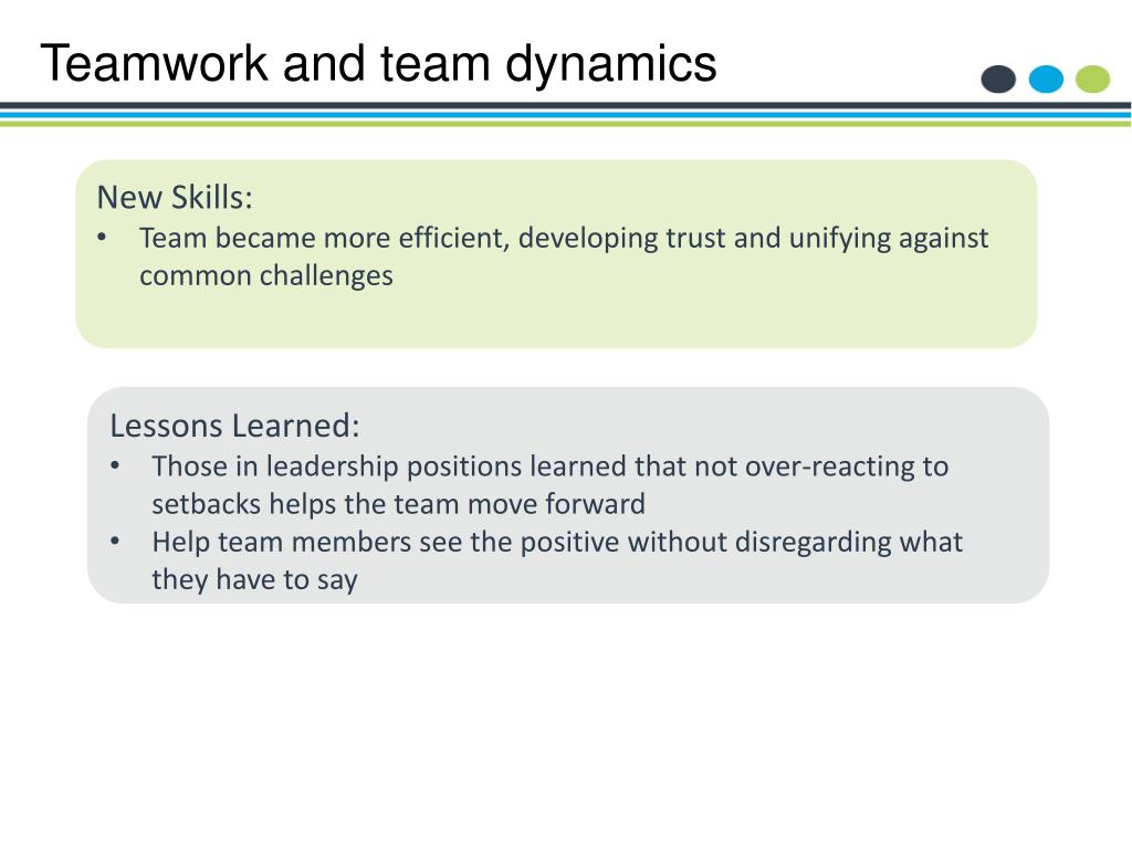 Teamwork and team dynamics • New Skills: • Team became more efficient, developing trust and unifying against common challenges • Lessons Learned: • Those in leadership positions learned that not over-reacting to setbacks helps the team move forward • Help team members see the positive without disregarding what they have to say