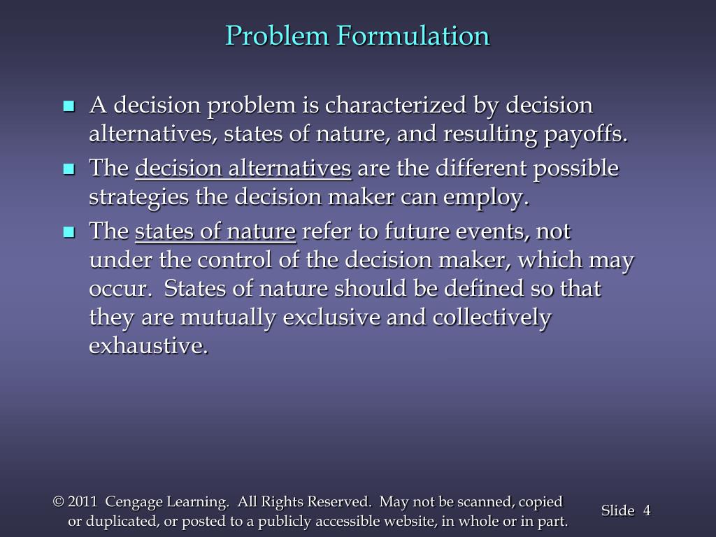 Problem Formulation • A decision problem is characterized by decision alternatives, states of nature, and resulting payoffs. • The decision alternatives are the different possible strategies the decision maker can employ. • The states of nature refer to future events, not under the control of the decision maker, which may occur. States of nature should be defined so that they are mutually exclusive and collectively exhaustive.