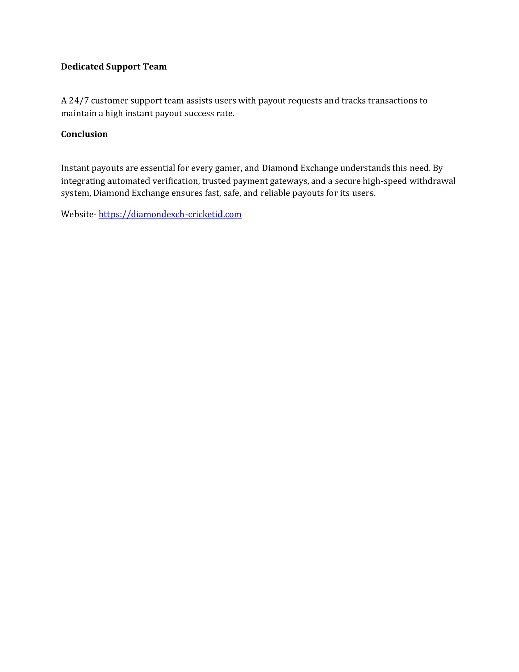 Dedicated Support Team A 24/7 customer support team assists users with payout requests and tracks transactions to maintain a high instant payout success rate. Conclusion Instant payouts are essential for every gamer, and Diamond Exchange understands this need. By integrating automated verification, trusted payment gateways, and a secure high-speed withdrawal system, Diamond Exchange ensures fast, safe, and reliable payouts for its users. Website- https://diamondexch-cricketid.com