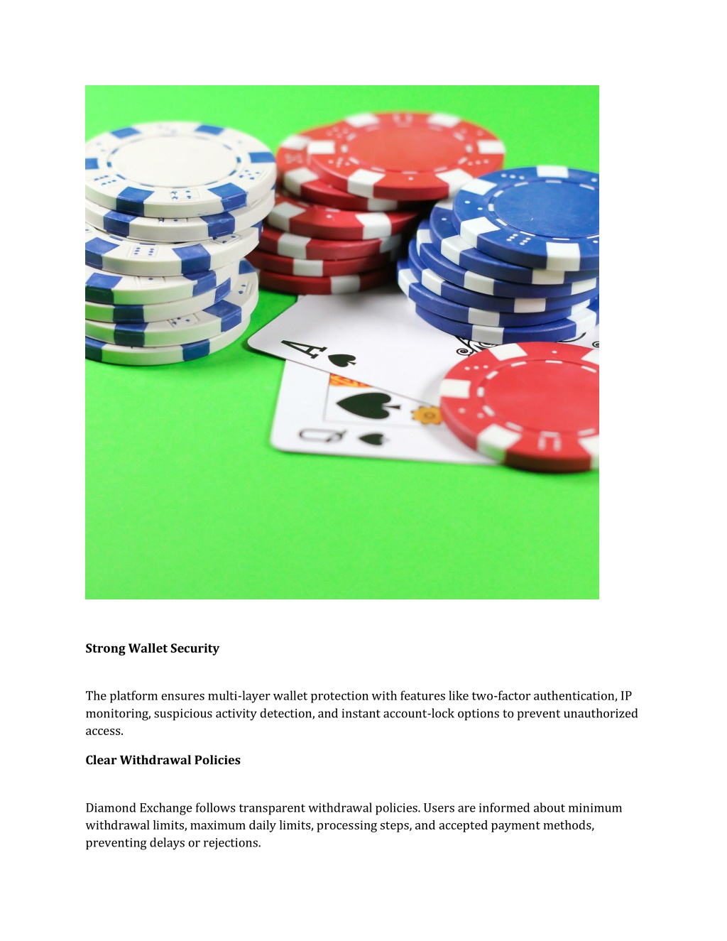 Strong Wallet Security The platform ensures multi-layer wallet protection with features like two-factor authentication, IP monitoring, suspicious activity detection, and instant account-lock options to prevent unauthorized access. Clear Withdrawal Policies Diamond Exchange follows transparent withdrawal policies. Users are informed about minimum withdrawal limits, maximum daily limits, processing steps, and accepted payment methods, preventing delays or rejections.