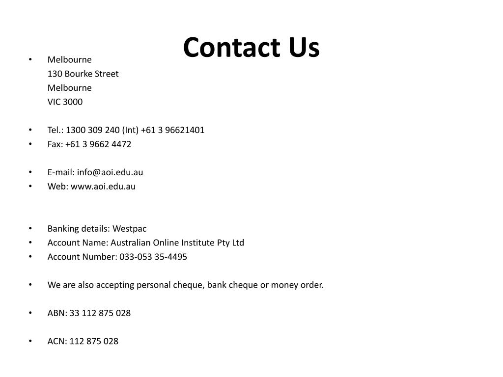 Contact Us • Melbourne 130 Bourke Street Melbourne VIC 3000 • Tel.: 1300 309 240 (Int) +61 3 96621401 • Fax: +61 3 9662 4472 • E-mail: info@aoi.edu.au • Web: www.aoi.edu.au • Banking details: Westpac • Account Name: Australian Online Institute Pty Ltd • Account Number: 033-053 35-4495 • We are also accepting personal cheque, bank cheque or money order. • ABN: 33 112 875 028 • ACN: 112 875 028