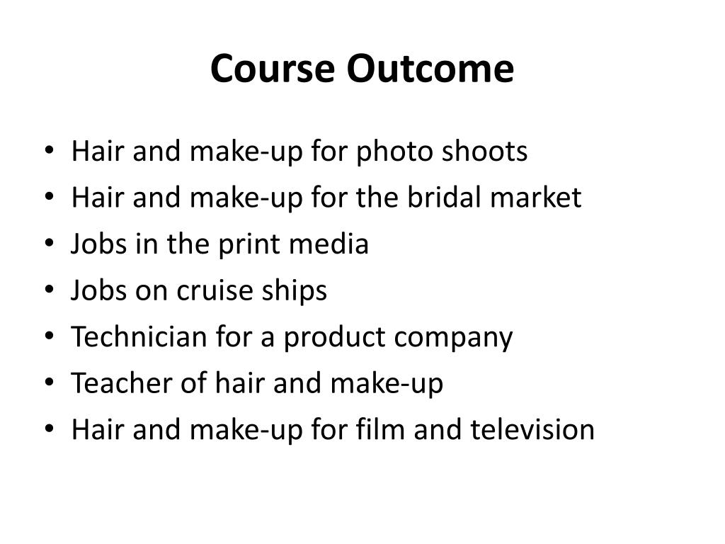 Course Outcome • Hair and make-up for photo shoots • Hair and make-up for the bridal market • Jobs in the print media • Jobs on cruise ships • Technician for a product company • Teacher of hair and make-up • Hair and make-up for film and television