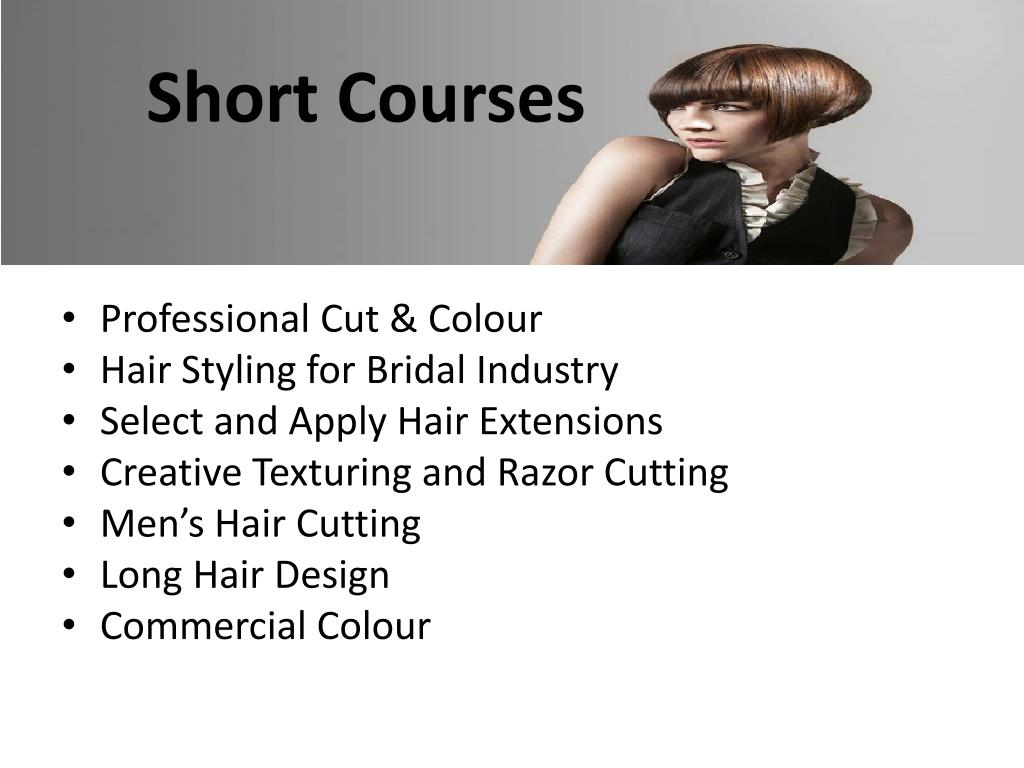 Short Courses • Professional Cut & Colour • Hair Styling for Bridal Industry • Select and Apply Hair Extensions • Creative Texturing and Razor Cutting • Men’s Hair Cutting • Long Hair Design • Commercial Colour