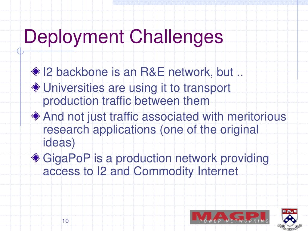 Deployment Challenges • I2 backbone is an R&E network, but .. • Universities are using it to transport production traffic between them • And not just traffic associated with meritorious research applications (one of the original ideas) • GigaPoP is a production network providing access to I2 and Commodity Internet