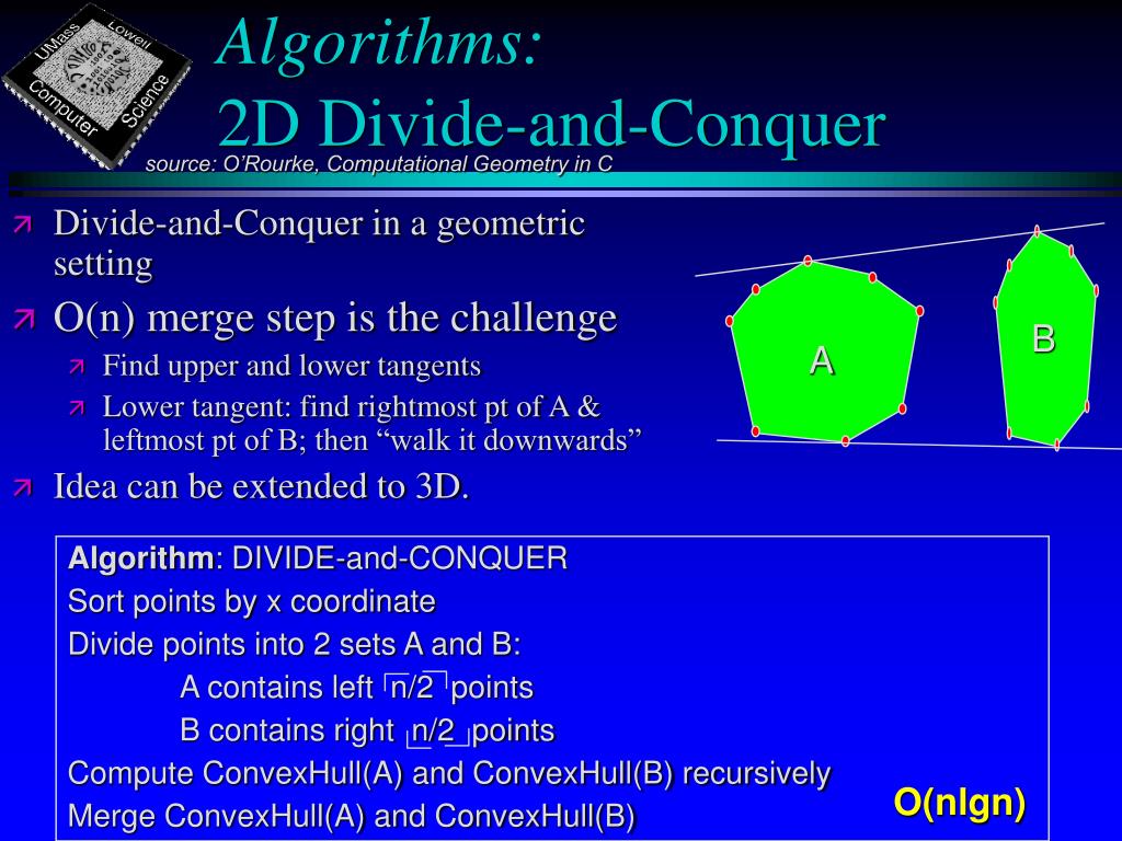 Algorithms:2D Divide-and-Conquer source: O’Rourke, Computational Geometry in C • Divide-and-Conquer in a geometric setting • O(n) merge step is the challenge • Find upper and lower tangents • Lower tangent: find rightmost pt of A & leftmost pt of B; then “walk it downwards” • Idea can be extended to 3D. B A Algorithm: DIVIDE-and-CONQUER Sort points by x coordinate Divide points into 2 sets A and B: A contains left n/2 points B contains right n/2 points Compute ConvexHull(A) and ConvexHull(B) recursively Merge ConvexHull(A) and ConvexHull(B) O(nlgn)