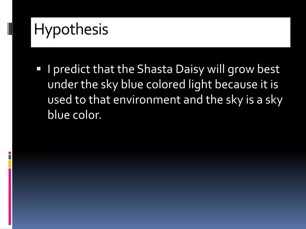 Hypothesis • I predict that the Shasta Daisy will grow best under the sky blue colored light because it is used to that environment and the sky is a sky blue color.