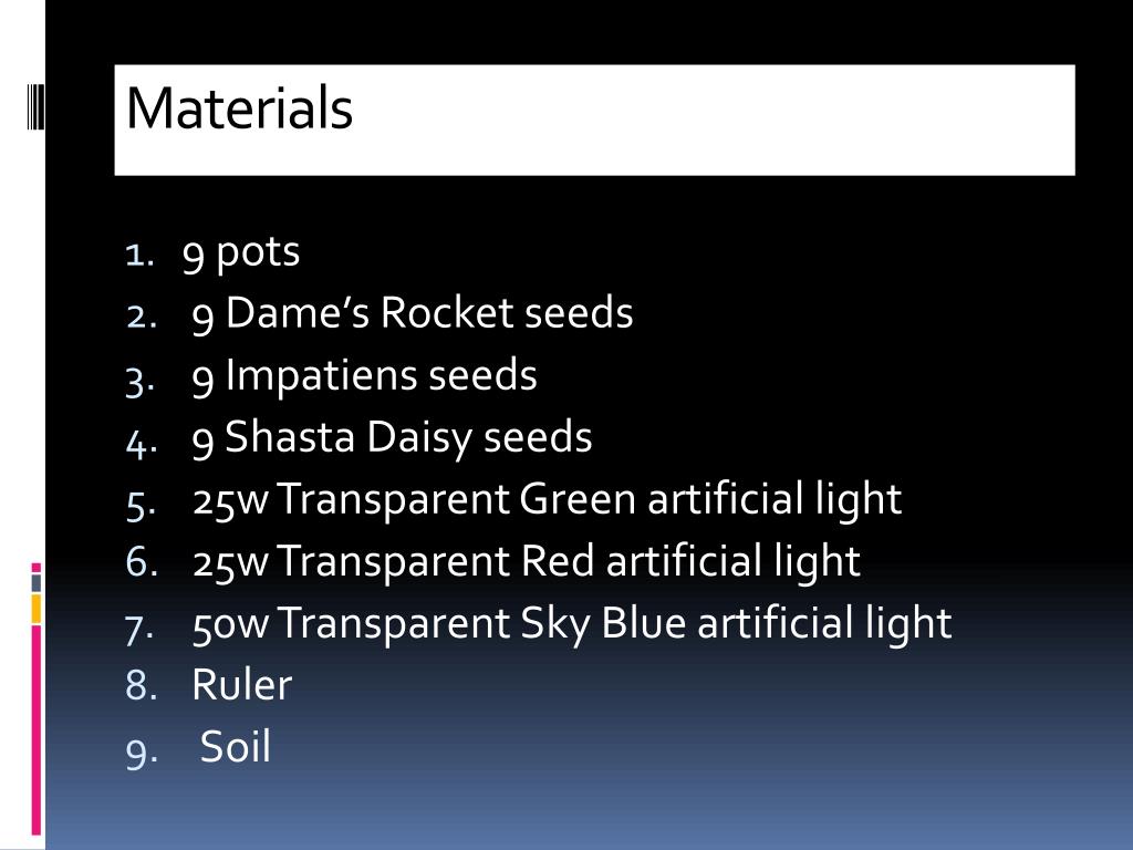 Materials • 9 pots • 9 Dame’s Rocket seeds • 9 Impatiens seeds • 9 Shasta Daisy seeds • 25w Transparent Green artificial light • 25w Transparent Red artificial light • 50w Transparent Sky Blue artificial light • Ruler • Soil