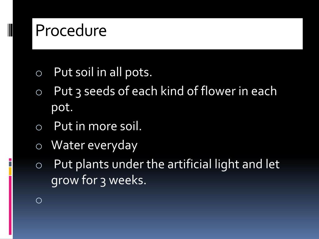 Procedure • Put soil in all pots. • Put 3 seeds of each kind of flower in each pot. • Put in more soil. • Water everyday • Put plants under the artificial light and let grow for 3 weeks.
