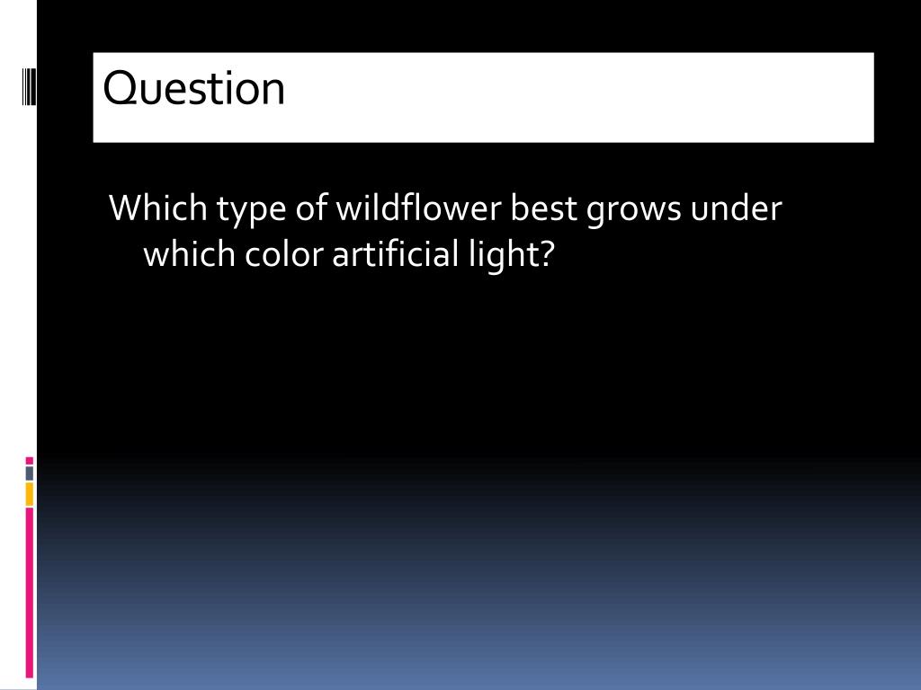 Wildflowers Kathryn Nace. Table of Contents. Title Table of Contents Question Hypothesis Material Procedures Conclusion Question Bibliography Encyclopedia Books Internet . Question. Which type of wildflower best grows under which color artificial light?. Hypothesis.