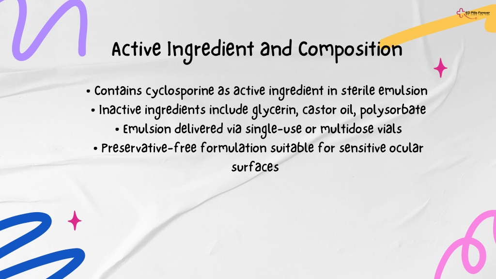Active Ingredient and Composition • Contains cyclosporine as active ingredient in sterile emulsion • Inactive ingredients include glycerin, castor oil, polysorbate • Emulsion delivered via single-use or multidose vials • Preservative-free formulation suitable for sensitive ocular surfaces