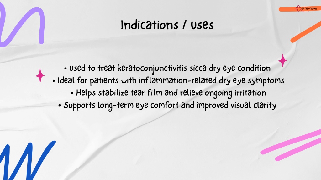 Indications / Uses • Used to treat keratoconjunctivitis sicca dry eye condition • Ideal for patients with inflammation-related dry eye symptoms • Helps stabilize tear film and relieve ongoing irritation • Supports long-term eye comfort and improved visual clarity
