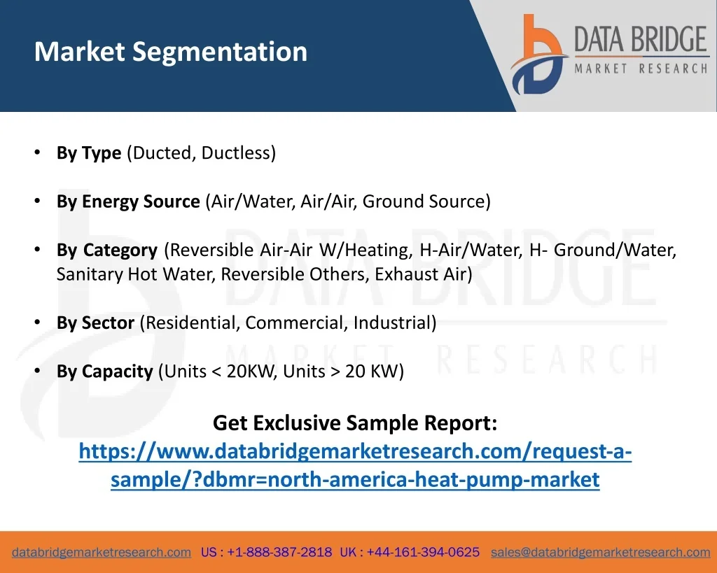 Market Segmentation • By Type (Ducted, Ductless) • By Energy Source (Air/Water, Air/Air, Ground Source) • By Category (Reversible Air-Air W/Heating, H-Air/Water, H- Ground/Water, Sanitary Hot Water, Reversible Others, Exhaust Air) • By Sector (Residential, Commercial, Industrial) • By Capacity (Units < 20KW, Units > 20 KW) Get Exclusive Sample Report: https://www.databridgemarketresearch.com/request-a-sample/?dbmr=north-america-heat-pump-market