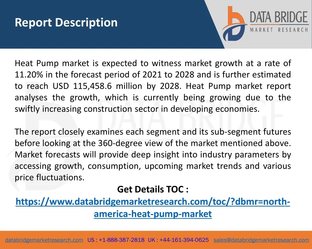Report Description Heat Pump market is expected to witness market growth at a rate of 11.20% in the forecast period of 2021 to 2028 and is further estimated to reach USD 115,458.6 million by 2028. Heat Pump market report analyses the growth, which is currently being growing due to the swiftly increasing construction sector in developing economies. The report closely examines each segment and its sub-segment futures before looking at the 360-degree view of the market mentioned above. Market forecasts will provide deep insight into industry parameters by accessing growth, consumption, upcoming market trends and various price fluctuations. Get Details TOC : https://www.databridgemarketresearch.com/toc/?dbmr=north-america-heat-pump-market