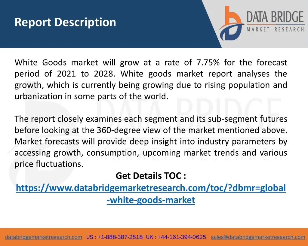 Report Description White Goods market will grow at a rate of 7.75% for the forecast period of 2021 to 2028. White goods market report analyses the growth, which is currently being growing due to rising population and urbanization in some parts of the world. The report closely examines each segment and its sub-segment futures before looking at the 360-degree view of the market mentioned above. Market forecasts will provide deep insight into industry parameters by accessing growth, consumption, upcoming market trends and various price fluctuations. Get Details TOC : https://www.databridgemarketresearch.com/toc/?dbmr=global-white-goods-market