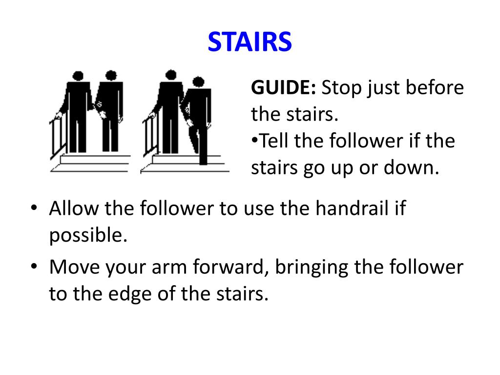 STAIRS • GUIDE: Stop just before the stairs. • Tell the follower if the stairs go up or down. • Allow the follower to use the handrail if possible. • Move your arm forward, bringing the follower to the edge of the stairs.