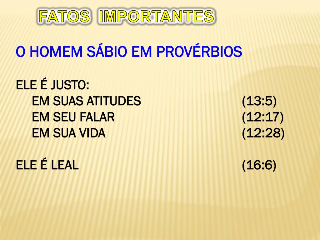FATOS IMPORTANTES • O HOMEM SÁBIO EM PROVÉRBIOS • ELE É JUSTO: • EM SUAS ATITUDES (13:5) • EM SEU FALAR (12:17) • EM SUA VIDA (12:28) • ELE É LEAL (16:6)