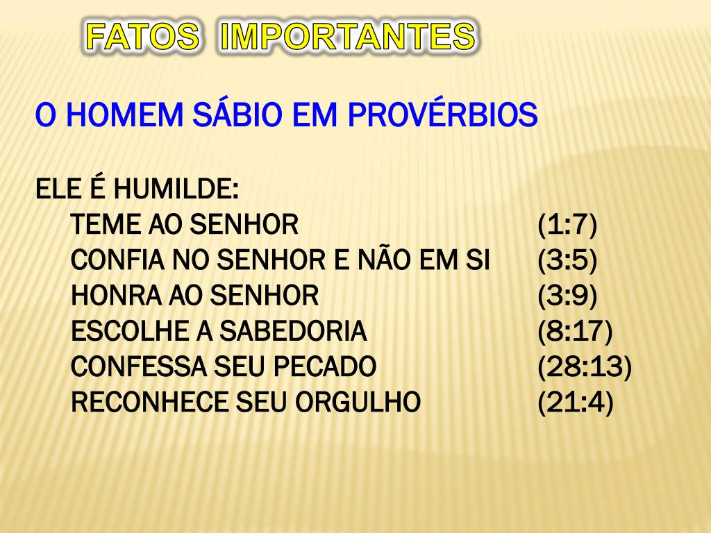FATOS IMPORTANTES • O HOMEM SÁBIO EM PROVÉRBIOS • ELE É HUMILDE: • TEME AO SENHOR (1:7) • CONFIA NO SENHOR E NÃO EM SI (3:5) • HONRA AO SENHOR (3:9) • ESCOLHE A SABEDORIA (8:17) • CONFESSA SEU PECADO (28:13) • RECONHECE SEU ORGULHO (21:4)