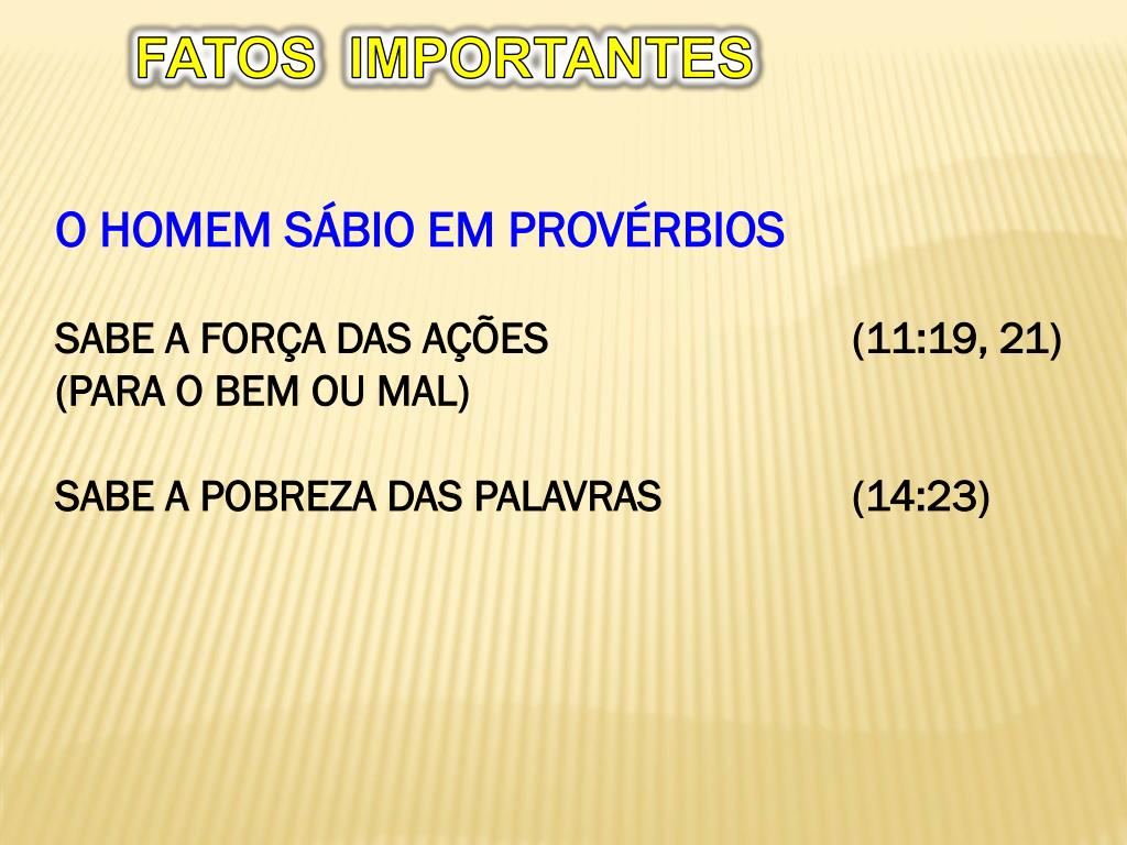 FATOS IMPORTANTES O HOMEM SÁBIO EM PROVÉRBIOS SABE A FORÇA DAS AÇÕES (11:19, 21) (PARA O BEM OU MAL) SABE A POBREZA DAS PALAVRAS (14:23)
