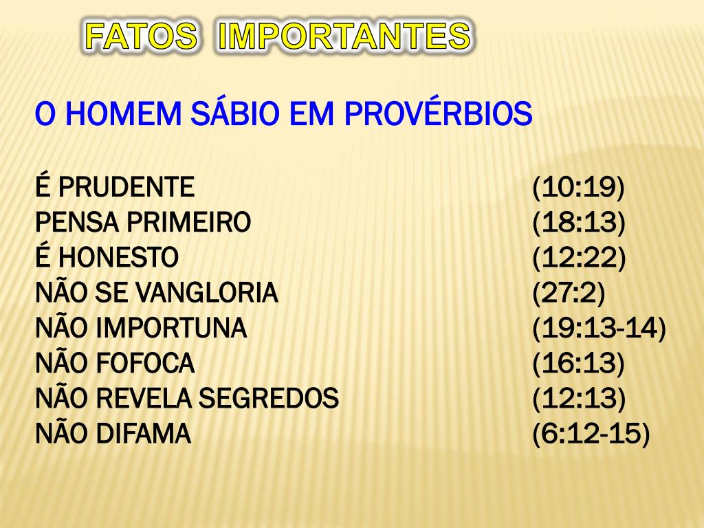 FATOS IMPORTANTES O HOMEM SÁBIO EM PROVÉRBIOS É PRUDENTE (10:19) PENSA PRIMEIRO (18:13) É HONESTO (12:22) NÃO SE VANGLORIA (27:2) NÃO IMPORTUNA (19:13-14) NÃO FOFOCA (16:13) NÃO REVELA SEGREDOS (12:13) NÃO DIFAMA (6:12-15)