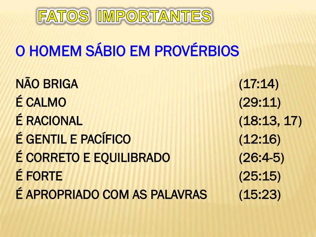 FATOS IMPORTANTES O HOMEM SÁBIO EM PROVÉRBIOS NÃO BRIGA (17:14) É CALMO (29:11) É RACIONAL (18:13, 17) É GENTIL E PACÍFICO (12:16) É CORRETO E EQUILIBRADO (26:4-5) É FORTE (25:15) É APROPRIADO COM AS PALAVRAS (15:23)
