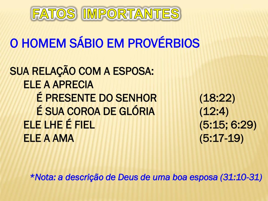 FATOS IMPORTANTES • O HOMEM SÁBIO EM PROVÉRBIOS • SUA RELAÇÃO COM A ESPOSA: • ELE A APRECIA • É PRESENTE DO SENHOR (18:22) • É SUA COROA DE GLÓRIA (12:4) • ELE LHE É FIEL (5:15; 6:29) • ELE A AMA (5:17-19) • *Nota: a descrição de Deus de uma boa esposa (31:10-31)