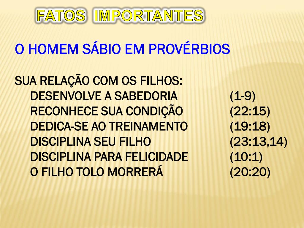 FATOS IMPORTANTES • O HOMEM SÁBIO EM PROVÉRBIOS • SUA RELAÇÃO COM OS FILHOS: • DESENVOLVE A SABEDORIA (1-9) • RECONHECE SUA CONDIÇÃO (22:15) • DEDICA-SE AO TREINAMENTO (19:18) • DISCIPLINA SEU FILHO (23:13,14) • DISCIPLINA PARA FELICIDADE (10:1) • O FILHO TOLO MORRERÁ (20:20)