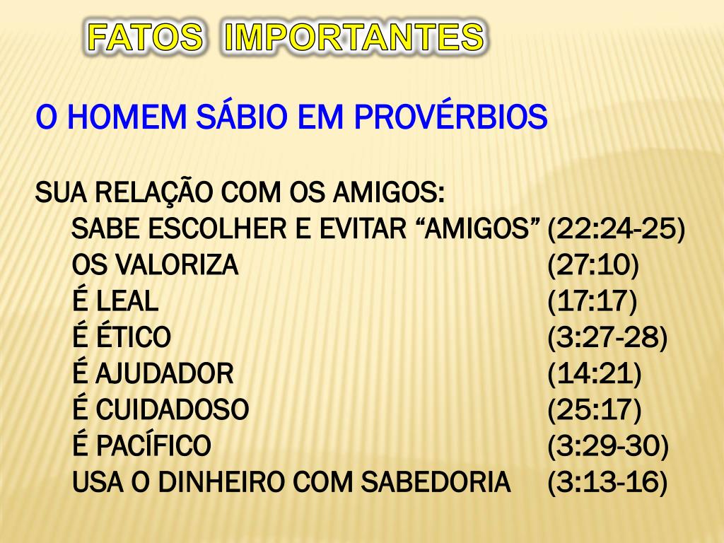 FATOS IMPORTANTES • O HOMEM SÁBIO EM PROVÉRBIOS • SUA RELAÇÃO COM OS AMIGOS: • SABE ESCOLHER E EVITAR “AMIGOS” (22:24-25) • OS VALORIZA (27:10) • É LEAL (17:17) • É ÉTICO (3:27-28) • É AJUDADOR (14:21) • É CUIDADOSO (25:17) • É PACÍFICO (3:29-30) • USA O DINHEIRO COM SABEDORIA (3:13-16)
