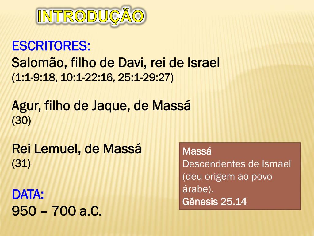INTRODUÇÃO ESCRITORES: Salomão, filho de Davi, rei de Israel (1:1-9:18, 10:1-22:16, 25:1-29:27) Agur, filho de Jaque, de Massá (30) Rei Lemuel, de Massá (31) DATA: 950 – 700 a.C. Massá Descendentes de Ismael (deu origem ao povo árabe). Gênesis 25.14