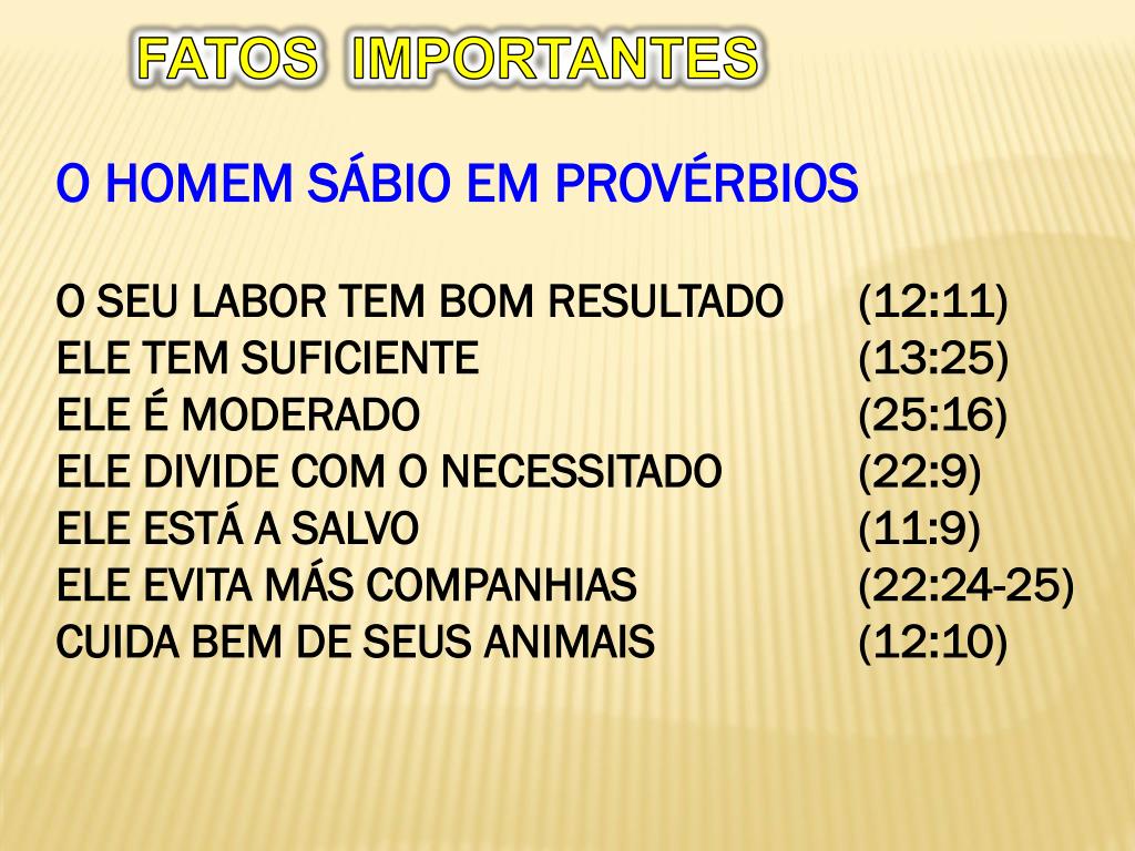 FATOS IMPORTANTES O HOMEM SÁBIO EM PROVÉRBIOS O SEU LABOR TEM BOM RESULTADO (12:11) ELE TEM SUFICIENTE (13:25) ELE É MODERADO (25:16) ELE DIVIDE COM O NECESSITADO (22:9) ELE ESTÁ A SALVO (11:9) ELE EVITA MÁS COMPANHIAS (22:24-25) CUIDA BEM DE SEUS ANIMAIS (12:10)