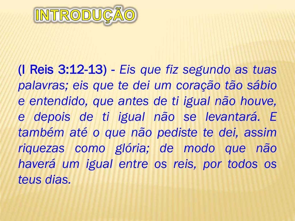 INTRODUÇÃO (I Reis 3:12-13) - Eis que fiz segundo as tuas palavras; eis que te dei um coração tão sábio e entendido, que antes de ti igual não houve, e depois de ti igual não se levantará. E também até o que não pediste te dei, assim riquezas como glória; de modo que não haverá um igual entre os reis, por todos os teus dias.