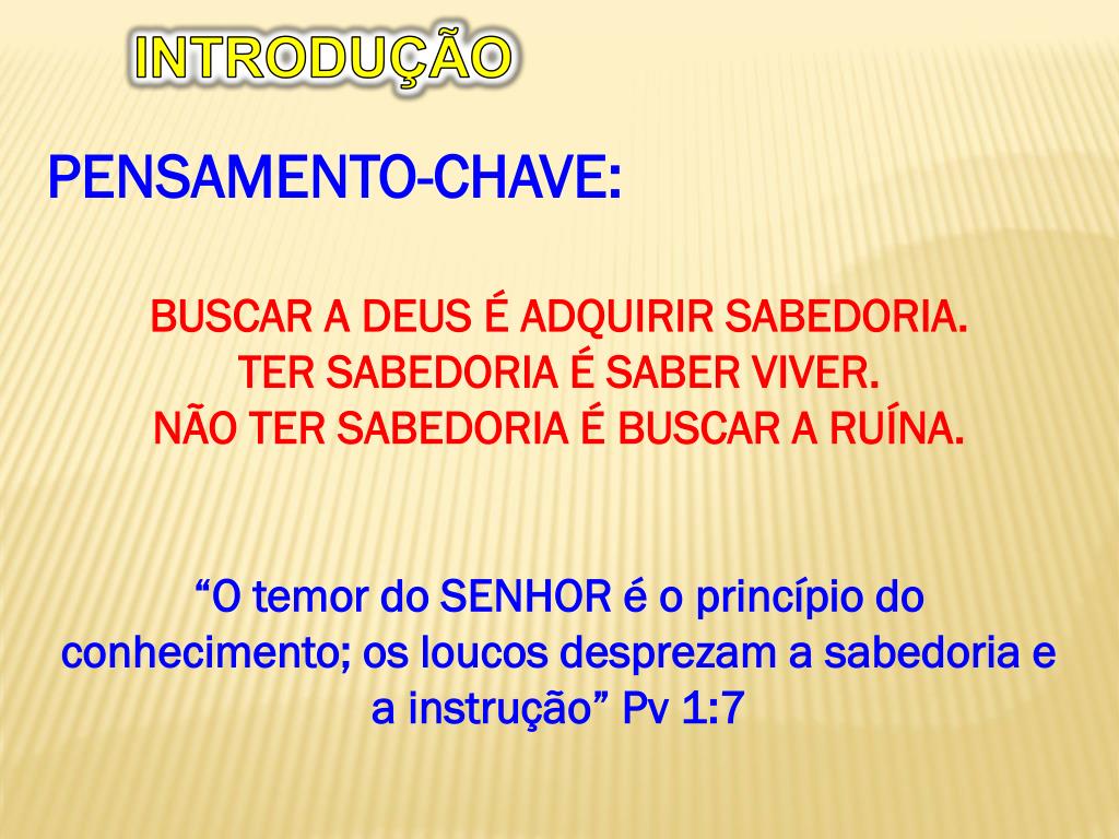 INTRODUÇÃO PENSAMENTO-CHAVE: BUSCAR A DEUS É ADQUIRIR SABEDORIA. TER SABEDORIA É SABER VIVER. NÃO TER SABEDORIA É BUSCAR A RUÍNA. “O temor do SENHOR é o princípio do conhecimento; os loucos desprezam a sabedoria e a instrução” Pv 1:7