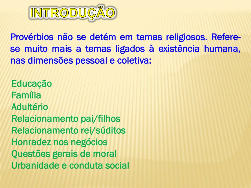 INTRODUÇÃO Provérbios não se detém em temas religiosos. Refere-se muito mais a temas ligados à existência humana, nas dimensões pessoal e coletiva: Educação Família Adultério Relacionamento pai/filhos Relacionamento rei/súditos Honradez nos negócios Questões gerais de moral Urbanidade e conduta social