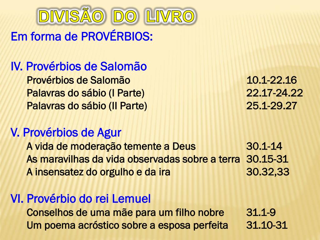 DIVISÃO DO LIVRO • Em forma de PROVÉRBIOS: • IV. Provérbios de Salomão • Provérbios de Salomão 10.1-22.16 • Palavras do sábio (I Parte) 22.17-24.22 • Palavras do sábio (II Parte) 25.1-29.27 • V. Provérbios de Agur • A vida de moderação temente a Deus 30.1-14 • As maravilhas da vida observadas sobre a terra 30.15-31 • A insensatez do orgulho e da ira 30.32,33 • VI. Provérbio do rei Lemuel • Conselhos de uma mãe para um filho nobre 31.1-9 • Um poema acróstico sobre a esposa perfeita 31.10-31