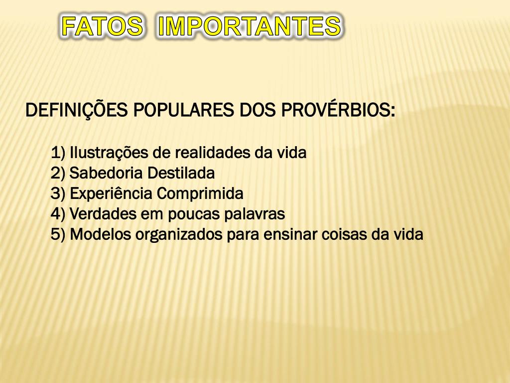 FATOS IMPORTANTES • DEFINIÇÕES POPULARES DOS PROVÉRBIOS: • 1) Ilustrações de realidades da vida • 2) Sabedoria Destilada • 3) Experiência Comprimida • 4) Verdades em poucas palavras • 5) Modelos organizados para ensinar coisas da vida