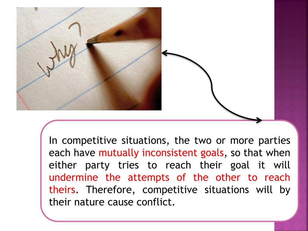 In competitive situations, the two or more parties each have mutually inconsistent goals, so that when either party tries to reach their goal it will undermine the attempts of the other to reach theirs. Therefore, competitive situations will by their nature cause conflict.
