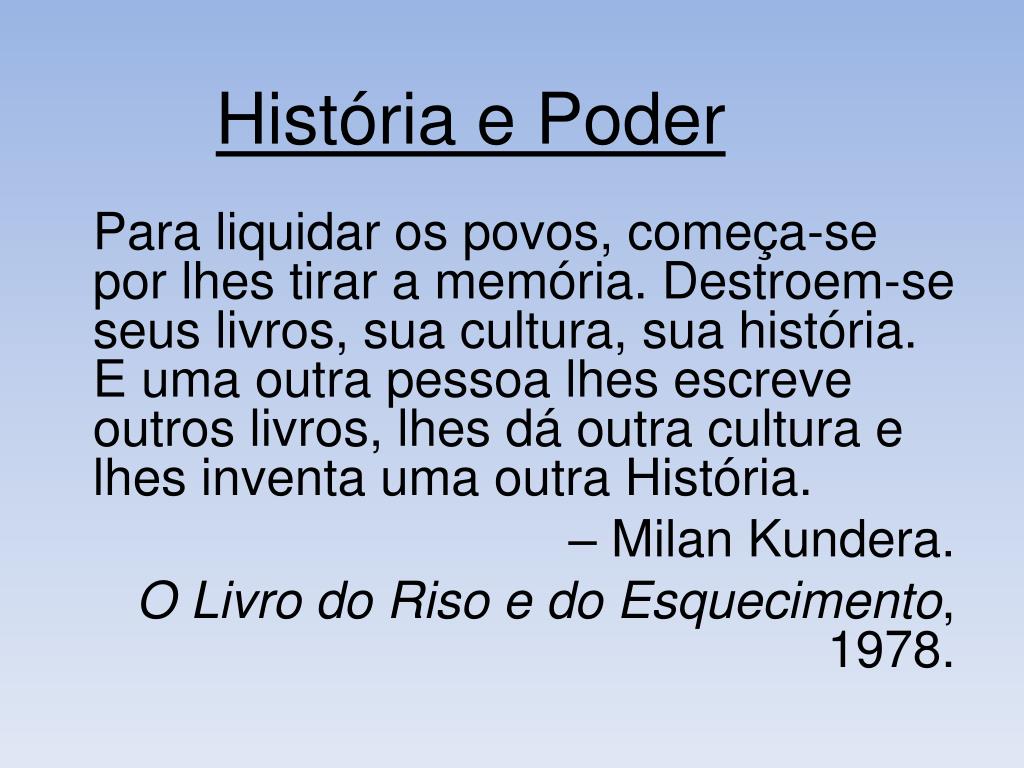 História e Poder Para liquidar os povos, começa-se por lhes tirar a memória. Destroem-se seus livros, sua cultura, sua história. E uma outra pessoa lhes escreve outros livros, lhes dá outra cultura e lhes inventa uma outra História. – Milan Kundera. O Livro do Riso e do Esquecimento, 1978.