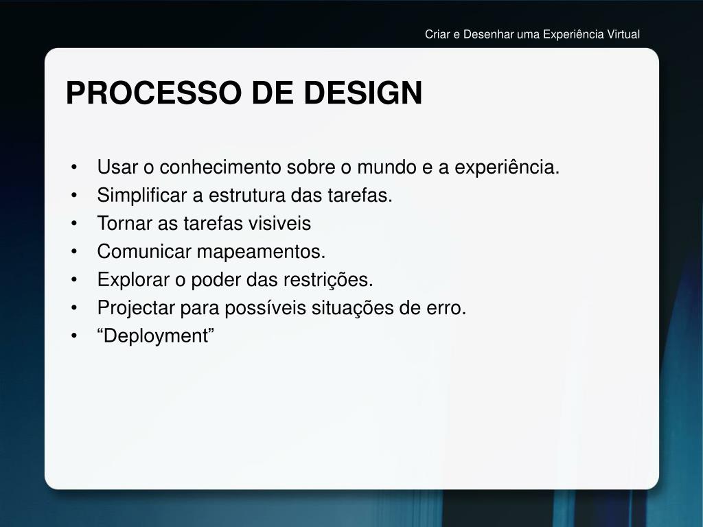 Criar e Desenhar uma Experiência Virtual PROCESSO DE DESIGN “The human mind is exquisitely tailored to make sense of the world. Give it the slightest clue and off it goes, providing explanation, rationalization, and understanding.” Donald Norman