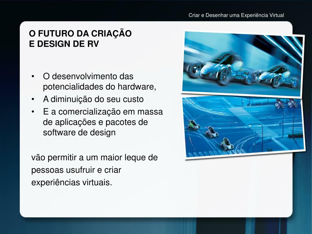 Criar e Desenhar uma Experiência Virtual O FUTURO DA CRIAÇÃO E DESIGN DE RV • O desenvolvimento das potencialidades do hardware, • A diminuição do seu custo • E a comercialização em massa de aplicações e pacotes de software de design vão permitir a um maior leque de pessoas usufruir e criar experiências virtuais.